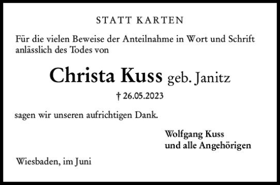 Anzeige Ursula Hess geb. WithTier