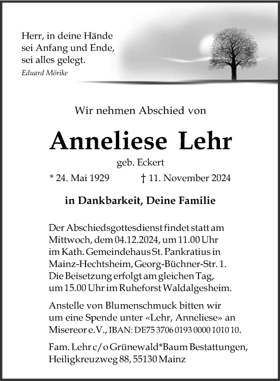 Traueranzeigen für Grünewald Baum Bestattungen GbR